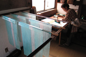 また、使用する紙には、摺込の前に羊毛のヒラバケでドウサを引きます。ドウサは水で溶かしたニカワにミョウバンを混ぜたもので、その分量は長年の勘により調整されます。ドウサを引くことによって紙にコシと艶が出るとともに、摺込による顔料のにじみを防止します。薄紙の典具帖にドウサを引く場合、紙は破れやすく、また、乾燥用の竿にかける途中で紙がくっつきやすいため、熟練を要します。白地の場合はそのまま摺り込みとなりますが、地色を付ける場合は、ドウサに染料を入れてハケで塗ります。天地引きが多く、天(上部)は空色、地(下部)は緑色で塗っていきます。