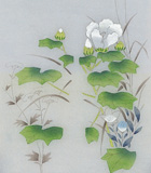 紙は100枚を一束とし、1手ごとに摺り込んでいきます。この時、羊毛を使ったボタンバケが使われ、摺り込む面積によって大きさを変えます。着色には顔料をニカワと水でとき、見本と同じ色になるように調合して乳鉢ですります。あらかじめ版摺りされた紙に、指定の場所へ型紙をあてて色をのせます。提灯は灯をともしてなお美しくなければならないので、ベタ塗りはいけません。立体感をもって摺り込むことが重要です。そのため、乳鉢にとかれた顔料はツケサシ(現在では歯ブラシ)によって掻き混ぜながら小皿にとり分け、そこでハケに顔料をつけます。微妙な濃淡も顔料のつけ方と、手首をきかせ「ハケの重さだけで摺り込む」というハケさばき、そして同じ花の部分でも何枚かに分けた型による色の変化によって表現されていきます。その他摺込の技法として、ハケにつけた顔料の量とハケさばきを調整することで、1手でグラデーションをかけて摺り込むボカシと呼ばれる方法があります。また、ハケにツケサシで2色のせ、1手で2色同時に摺り込む場合もあります。これは主に手間をかけない安価な製品の場合に使われます。そして数をこなす必要から、必ず綴じてある天から地へ、左から右への方向を基本として摺り込んでいき、仕上がると同時に紙をめくります。